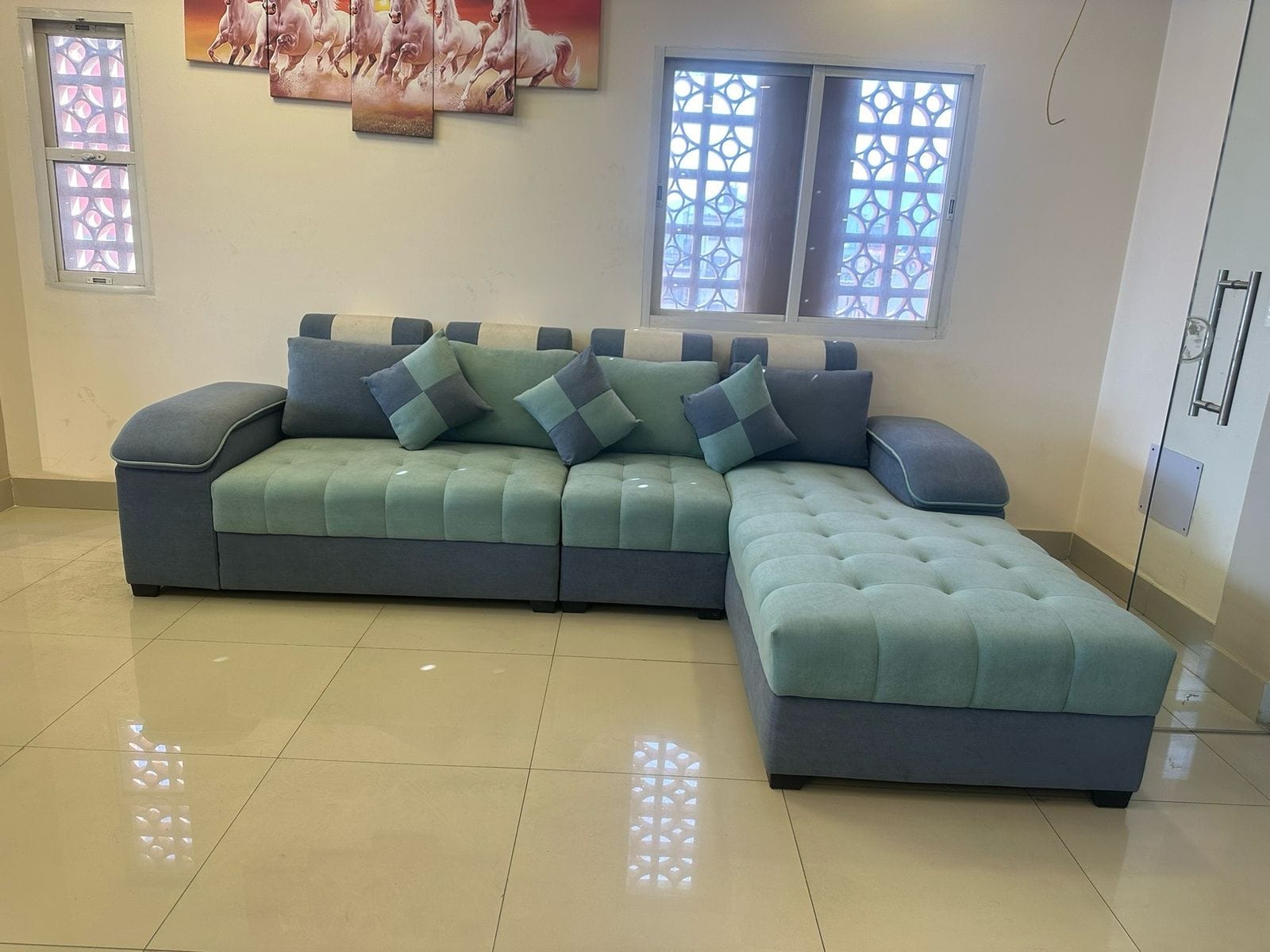 Featuring a sophisticated blend of grey and ocean green fabric upholstery, this L-shaped sofa is designed to make a bold statement. This sectional sofa consists of a main seating area and a comfortable chaise lounge, perfect for stretching out and relaxing. The set includes several decorative pillows in solid blue, solid beige, and a stylish checkered pattern combining both colors, offering a harmonious balance of style and comfort.